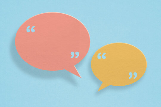 Conceptual image about communication and social media, customer feedback, yellow and pink speech bubble and quote sign grunge paper cut on grunge blue background