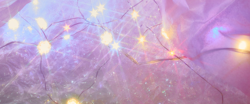 Pink materials with Christmas lights and branch