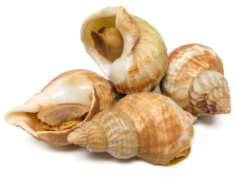 Uncooked fresh common whelks or sea snails displayed against a white studio background. Traditionally pickled and consumed.