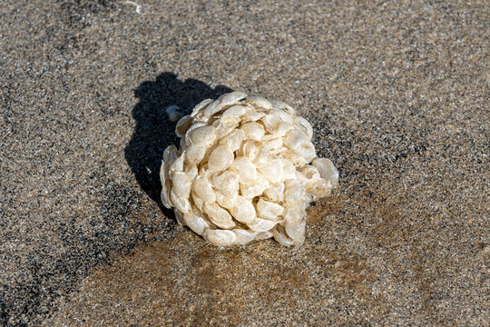 Whelk eggs clouds (Buccinum undatum) washed up on a sandy beach in South Wales UK which are  commonly known as fisherman's soap or sea wash balls, stock photo image