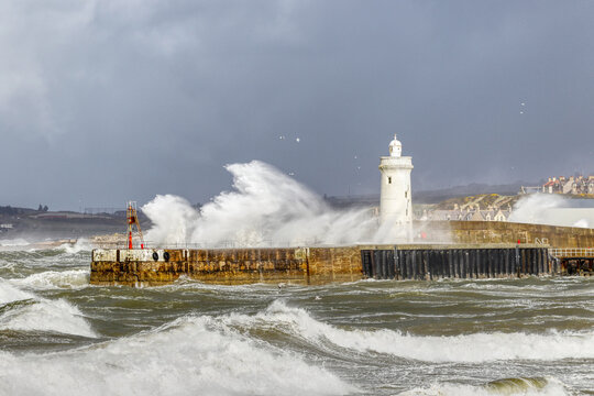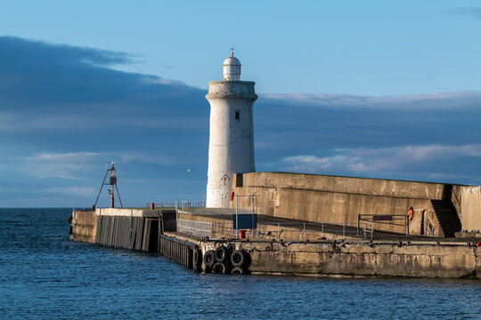 BUCKIE,MORAY, SCOTLAND - 23 JANUARY 2022: This is the sun shining on the entrance to the harbour at Buckie, Moray, Scotland on 23 January 2022.