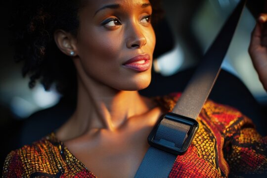 Photo of a business woman sitting in a car putting on her seat belt.