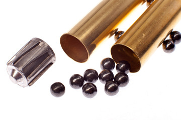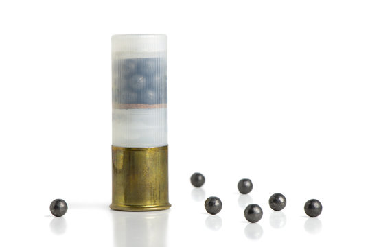 Macro photo of a 12-gauge cartridge with a charge of buckshot, a transparent plastic case.