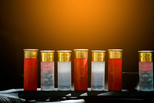 Shotgun shells reloading process with special reload equipment. Powder, bullets, fraction, shells, buckshot on the wooden background.