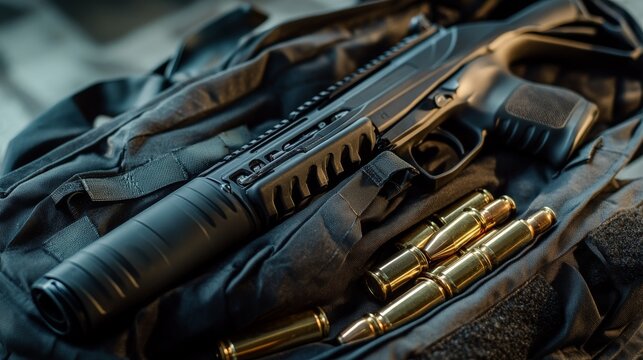 A black 12-gauge pump-action shotgun and ammo are on a canvas backpack. A smooth-bore weapon with a plastic stock. Dark back