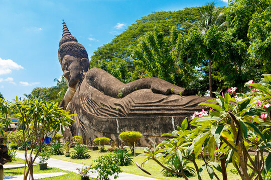 Buddha statue and  White flower  on blue backdrop, copy space Buddhist holy day celebrating