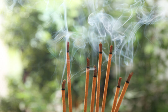 Incense sticks smoldering on green blurred background, space for text