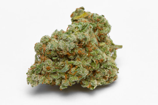 Marijuana product, trimmed buds in a jar. Medicinal cannabis stuff on white background, isolated, top view. CBD recreation, medical usage, pastime therapy.