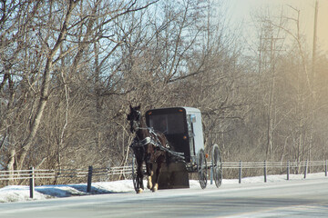 Amish horse and buggy on road. New York state, winter 2021