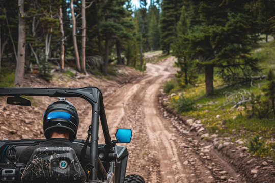 A man in a helmet rides as a co-driver in a buggy on a dirt road in the middle of nature. The scene is adventurous and exciting