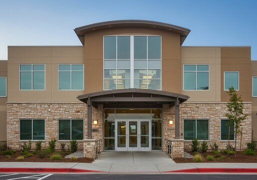 Modern two story office building with large glass windows and rooftop garden, surrounded by greenery and clear blue sky. contemporary architecture features clean lines and spacious parking area
