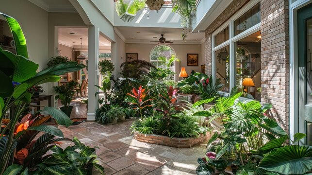 Modern glass office building featuring sunlit atrium with indoor trees, sustainable architecture with floor-to-ceiling windows and natural daylight streaming through.
