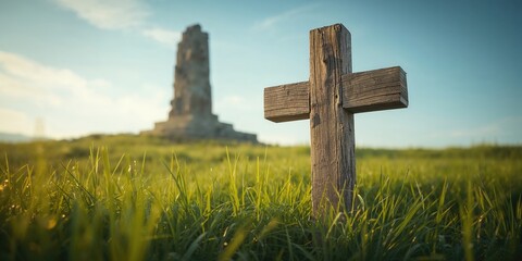 Crosses made of wood and stone positioned within a landscape featuring grass and architectural elements, highlighting travel sites