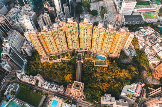 Hong Kong - 13 March 2022: Aerial View of a residential building at Sunset in Hong Kong Island.