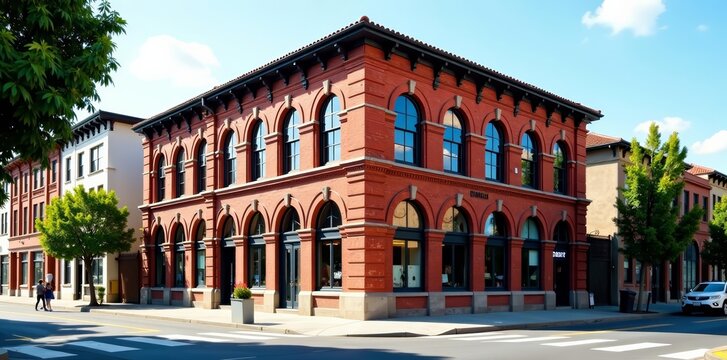 Abandoned red brick building on a street corner with trees and clear sky. Urban decay scene. Design for poster, banner