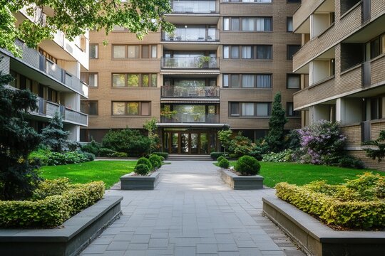 Courtyard with sidewalk and modern apartment building in contemporary residential district.