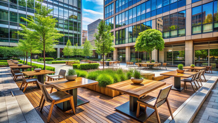 Cozy outdoor courtyard with modern furniture, autumn trees, for relaxation & living