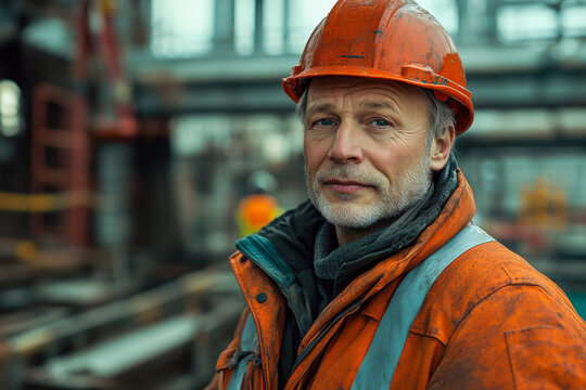 A construction worker stands confidently at a bustling job site, dressed in safety gear, showcasing his expertise and dedication