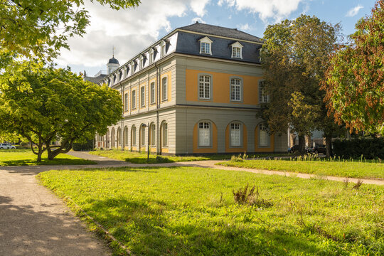 View of an elegant university yellow building with a grey roof surrounded by lush greenery and a manicured lawn bathed in sunlight, Bonn, North Rhine-Westphalia, Germany.