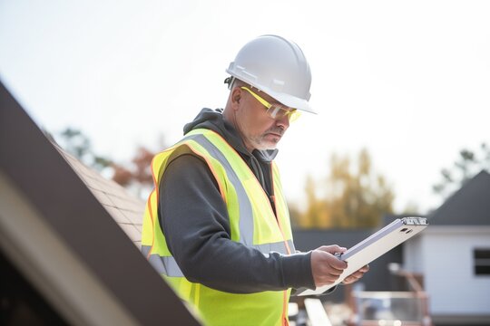 Construction worker conducting inspection with clipboard