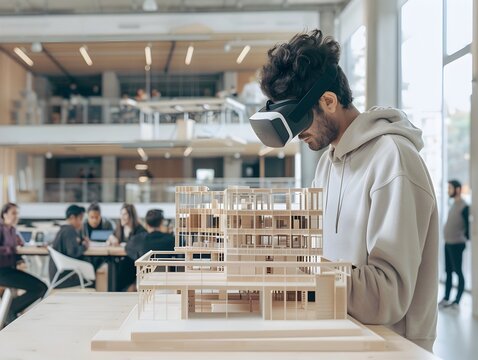 Architectural designer using vr headset with building model