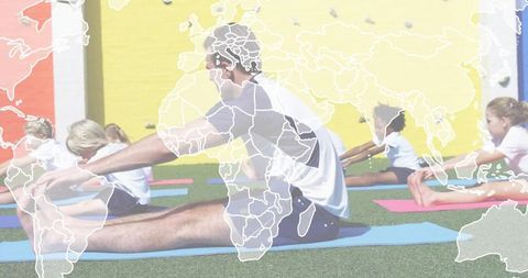 Male coach guiding children stretching on colorful outdoor turf mural with yoga mats