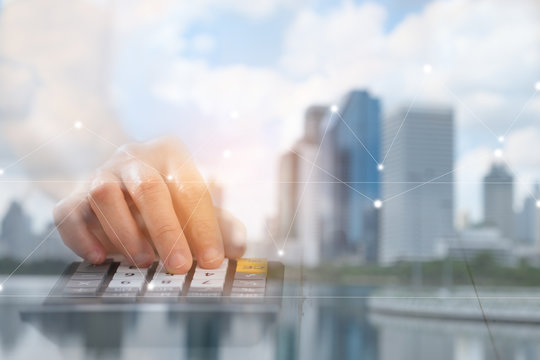 Contemplative executive analyzing data on a tablet with a vibrant cityscape and financial overlays merging technology with urban business landscapes