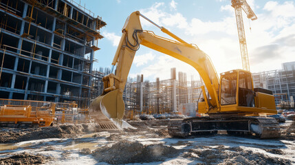 A yellow excavator operates at a bustling construction site, surrounded by unfinished buildings and cranes under a bright, sunny sky.