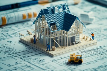 Miniature house model with construction workers and blueprints, representing the process of building a new home.