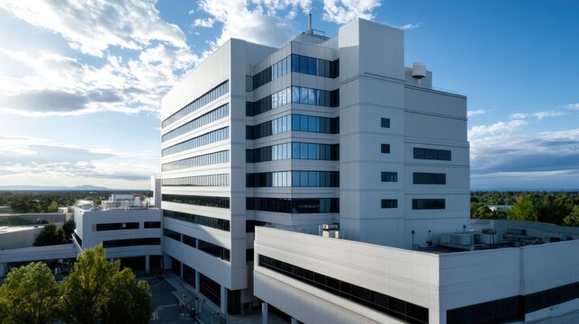 A modern hospital building stands against a serene sky, symbolizing hope and advanced healthcare with its sleek architectural design.