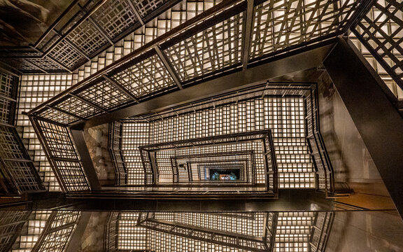 View of beautiful lighted staircase with mesmerizing reflections and intricate architecture, Ginza, Tokyo Metropolis, Japan.