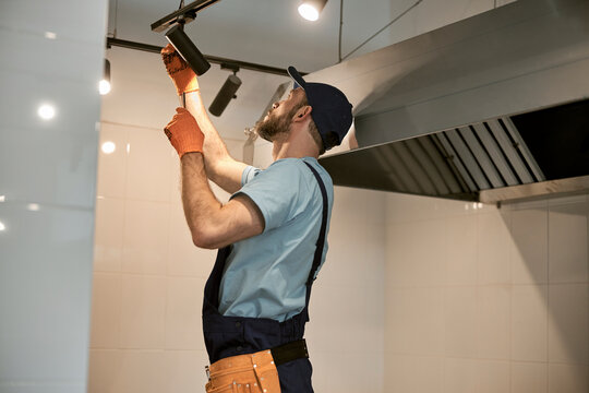 Air conditioning, technician or engineer on roof for maintenance, building or construction of fan hvac repair. Air conditioner, handyman or worker with tools working on a city development project job