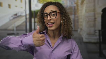 Woman wearing purple shirt and tortoiseshell glasses gives thumbs up under sunlight on narrow old town street; confidence.