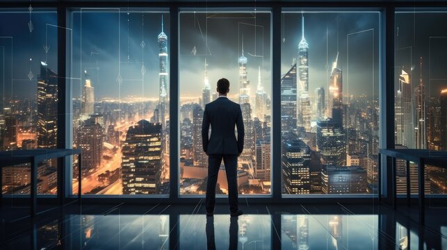 A businessman stands atop a glass building, surrounded by magnificent reflections, with the sun setting against the city skyline.