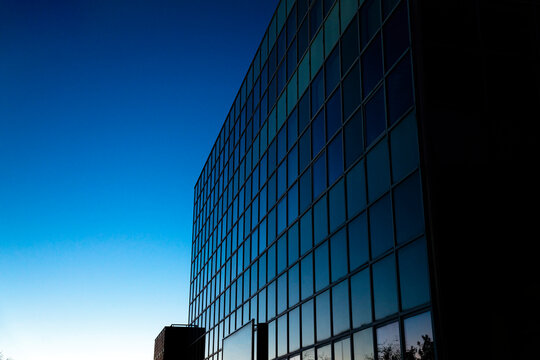 Modern glass building reflecting dramatic sunset sky