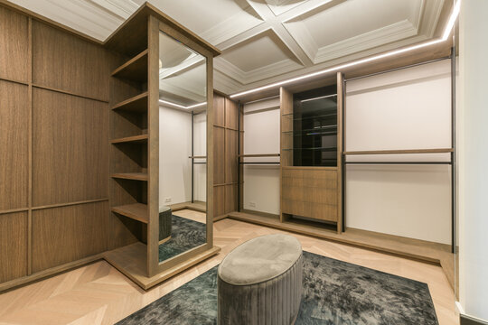 Luxury, modern design of walk in closet with stainless frame, wooden wardrobe in dark brown interior design bedroom with bed, desk, book shelf, floor lamp on carpet floor for decoration background 3D