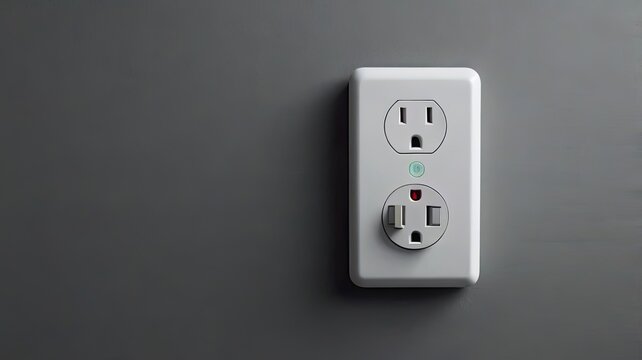Close up shot of a standard north american duplex electrical outlet on a gray wall surface indoors