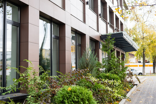 Big gray, metal planters with foliage plants and terrace design with a modern mix of construction material. Bushes against a building with big window