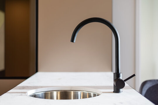 Washing dishes in rustic concrete kitchen with curved faucet and warm natural light