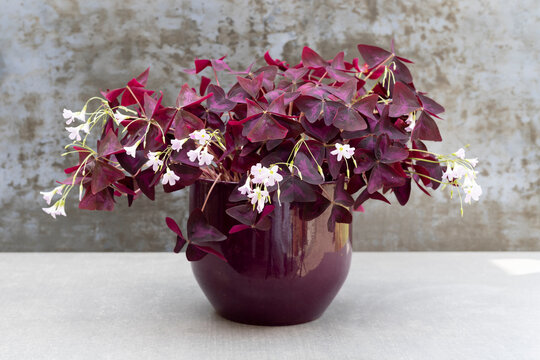 Oxalis Triangularis purple shamrock plant in glossy purple planter