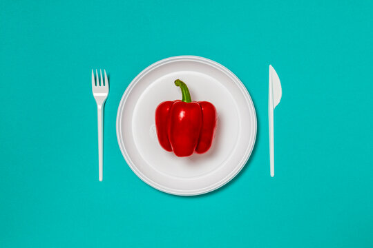 Red bell pepper on a white plate, fork and knife, dieting, healthy food concept
