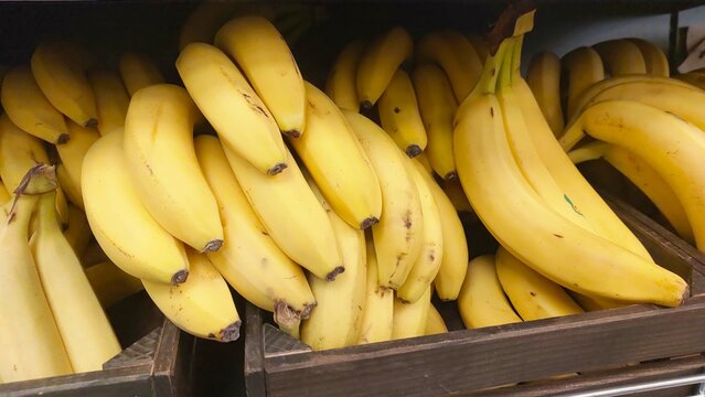 Fresh Bananas in a Wooden Box Display at a Market Ready for Customers to Purchase