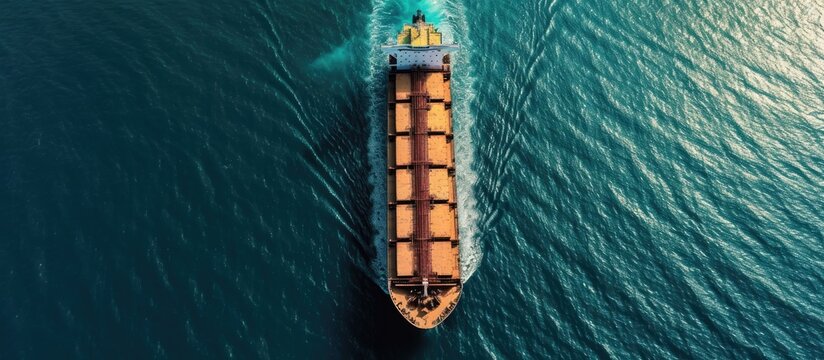 Bulk carrier ship visually observed at sea anticipating entrance to port, Aerial perspective.