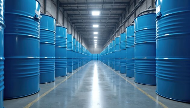 Rows of blue industrial storage barrels fill large warehouse interior. Cylindrical containers for chemicals liquids stand in neat aisles under bright overhead lighting. Clean empty facility organized