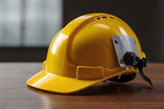 Close up of a yellow safety helmet on the table. A yellow hard hat.