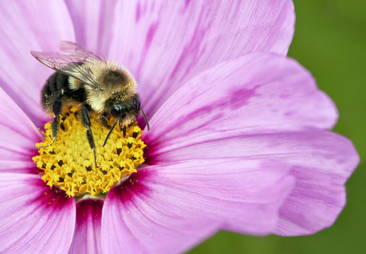 Bumblebee pollinating flower, bumble bee on pink flower, close up.