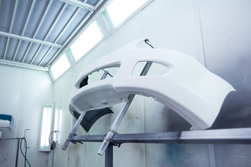 Car bumper befor painting in a cars spray booth. Bumper covered wtith base paint prepared for painting. Car bumper after base paint. Auto vehicle primer bumper. Parts of car in cars spray booth.