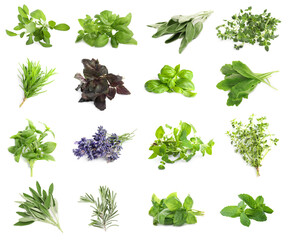 Set with different aromatic herbs on white background