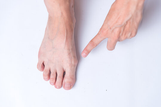 Closeup inflammation of deform bunion joint in big toe bone. Hallux valgus, bunion in female foot compare with typical foot isolated on white background.