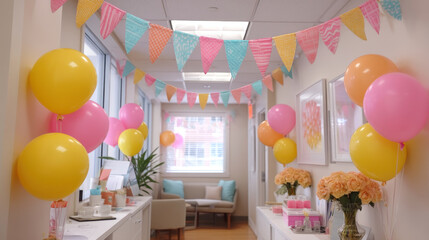 Happy work anniversary celebration with colorful balloons and pastel bunting decorating cozy office hallway creating joyful and festive atmosphere for event